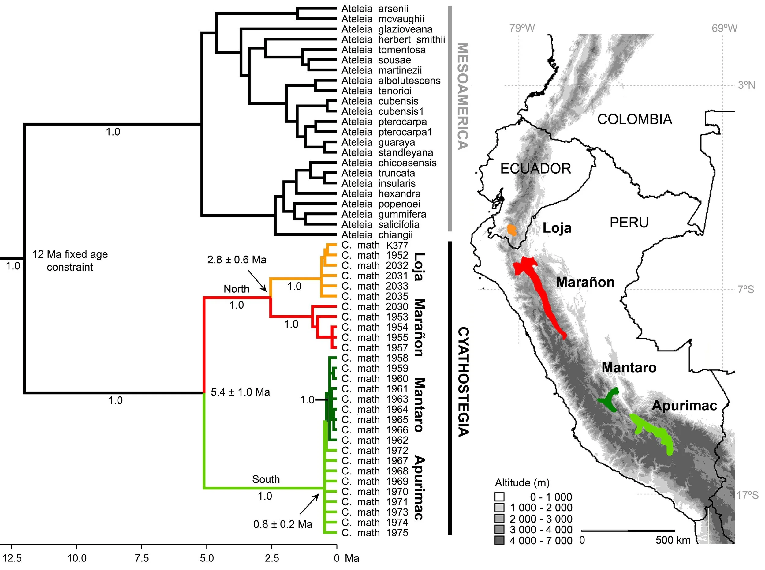A distinctive strand of our work builds upon RBGE's long history of research in seasonally dry biomes and asks the question of whether evolutionary and biogeographic processes have been distinct in different biomes. This paper in PNAS provided an example of how clades endemic to seasonally dry tropical forest show older, geographically structured patterns, contrasting more recent, geographically less structured rain forest and savanna diversifications. It demonstrated extraordinary antiquity (c. 5 million years) of populations of the legume shrub Cyathostegia matthewsii suggesting Andean dry valleys are museums of diversity that merit much greater conservation protection